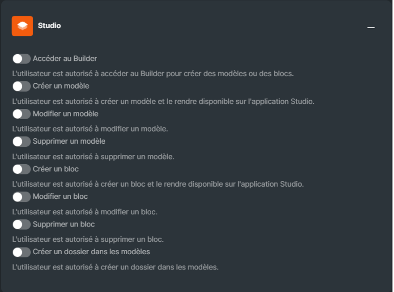 Depuis votre compte administrateur, il suffit de suivre ce chemin pour accéder au paramétrage : Profil > Gestion des utilisateurs > Autorisations > Studio.