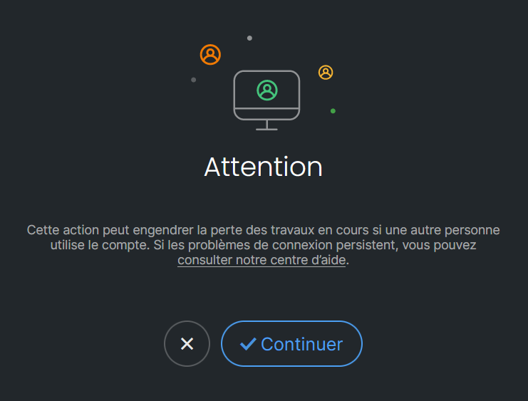 Vous ne pouvez pas vous connecter à votre compte avec les mêmes identifiants sur plusieurs ordinateurs ou autres appareils simultanément. Tout partage d'identifiants comporte un risque majeur : la déconnexion de l'utilisateur enregistré, et par conséquent la perte potentielle de contenus en cours de modification :