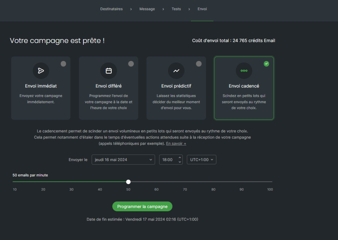 Vous choisirez alors grâce à la réglette sur votre écran le nombre d'emails à faire parvenir par minute. Plus bas, la date estimée de fin de votre envoi sera affichée. Vous pouvez également programmer cet envoi.