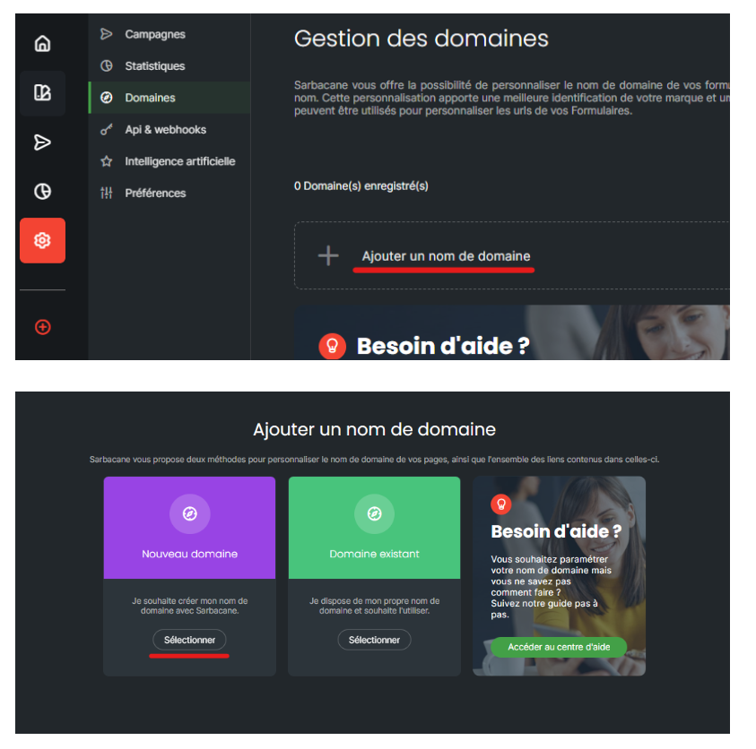 Rendez-vous dans la section “Domaines” des paramètres de Sarbacane Campaigns. Cliquez sur “Ajouter un nom de domaine”, puis “Nouveau domaine” pour créer votre nom de domaine avec Sarbacane.