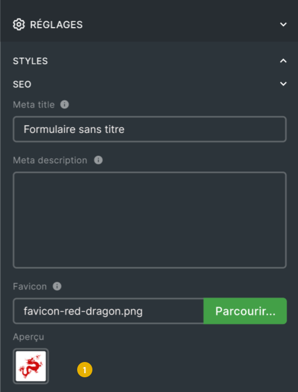 L’éditeur de formulaires (aussi appelé Form Builder) permet dans la section “Réglages” en bas à droite de votre écran d’optimiser votre formulaire pour son référencement naturel.