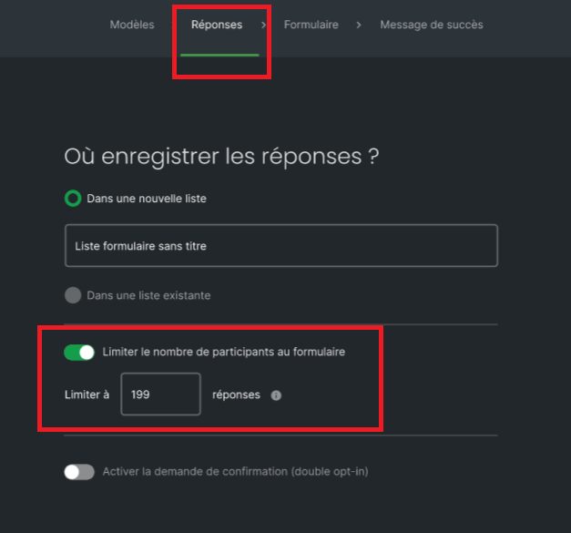 En complément de cette activation, personnalisez à l’aide de chiffres le nombre de réponses à partir duquel le formulaire sera clôturé (de 1 à 99999).