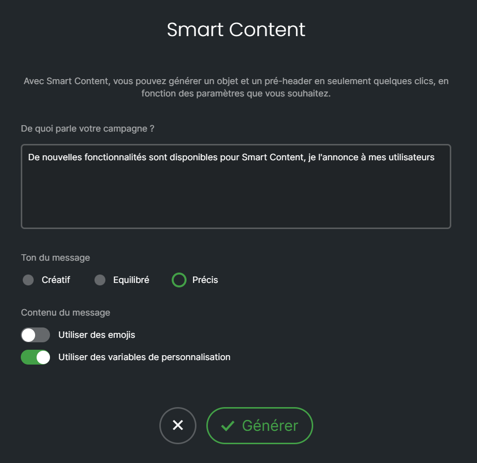 Smart Content est cependant capable de générer l’objet et le pré-header à partir d’une version en cours de travail ou d’un simple modèle. Toutefois, la pertinence des suggestions dépendra du niveau d’aboutissement de votre propre rédaction.