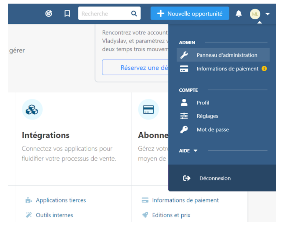 Cliquez sur “Panneau d’administration”, puis “Applications tierces” et sélectionnez “Sarbacane Engage” en vous assurant que la connexion API est bien valide.