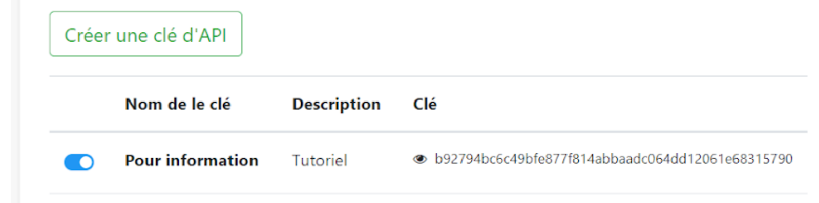 4. Cliquez sur l'œil pour pouvoir copier la clé complète en sélectionnant tous les caractères. Ces caractères ne sont pas ceux s’affichant sur le visuel ci-dessus, chaque clé générée vous est propre.