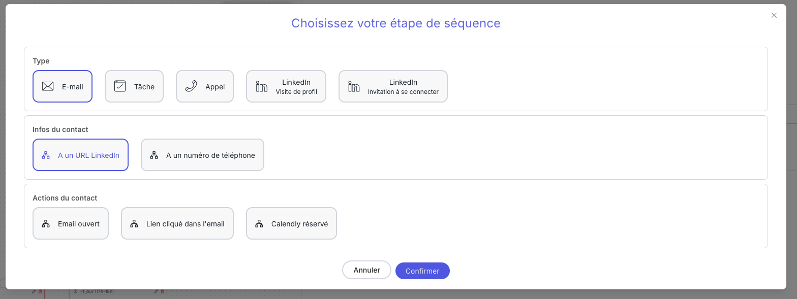 Suite à cet email, la séquence vérifie si une URL LinkedIn est disponible : si c’est le cas, une visite de profil aura lieu, puis une demande de connexion peu de temps après.