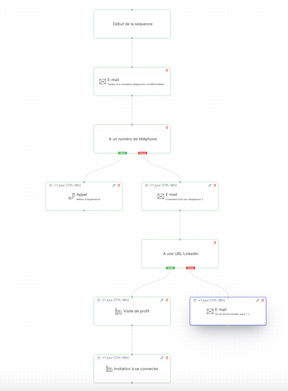 Bon à savoir : il n’est pas obligatoire de créer deux branches pour chaque action réalisée par le compte, les “vrai” et “faux” liés aux informations et actions du contact peuvent tous deux diriger vers la même action. Pratique pour clarifier votre séquence si plusieurs utilisateurs la supervisent.