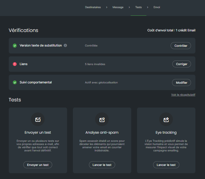 Accédez à l'étape Tests de votre campagne : C'est à cet endroit que vous pouvez tester votre campagne avant de la diffuser à l'ensemble de votre liste.