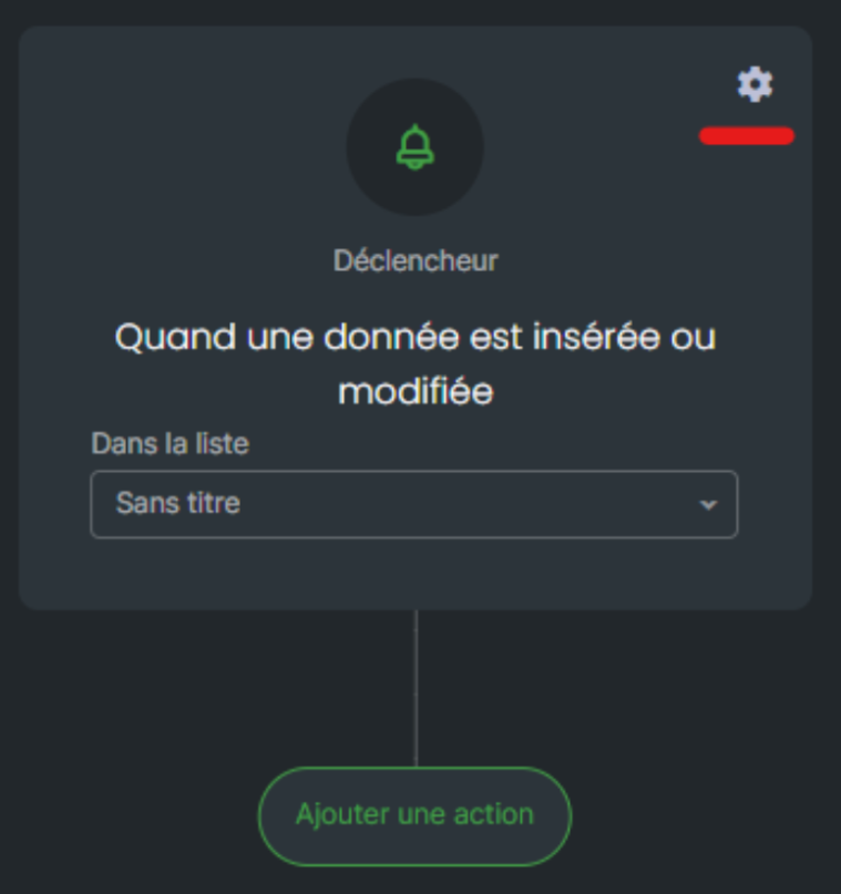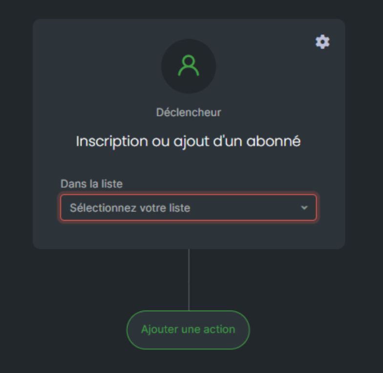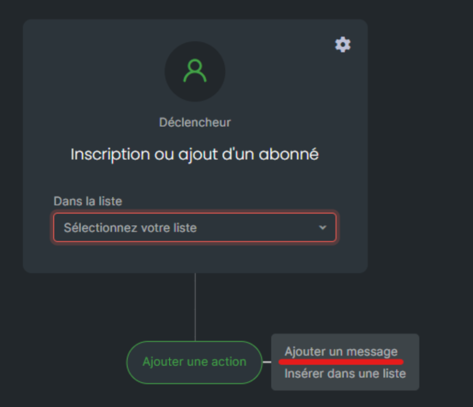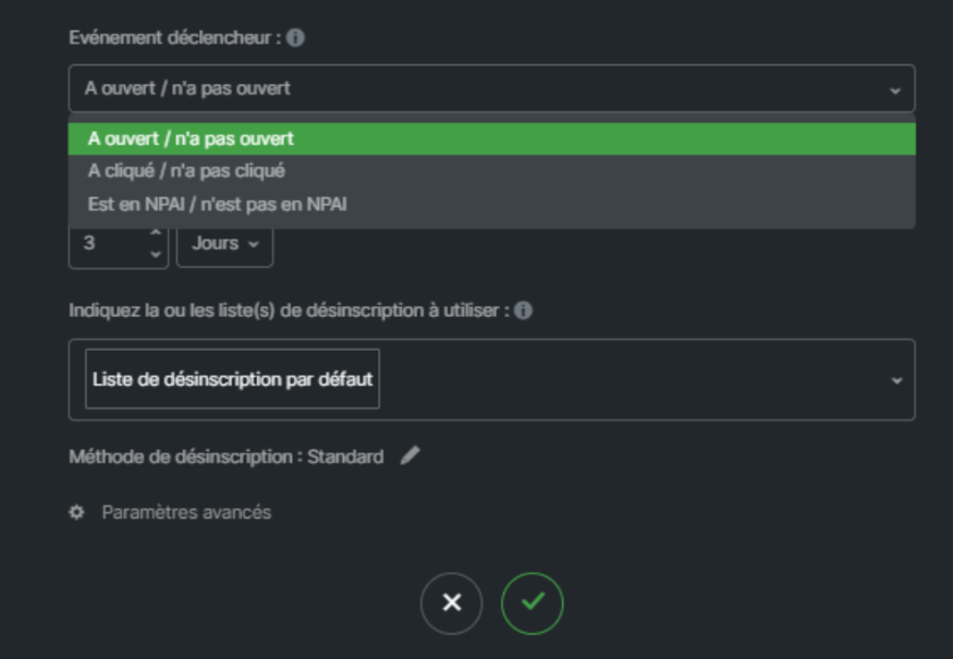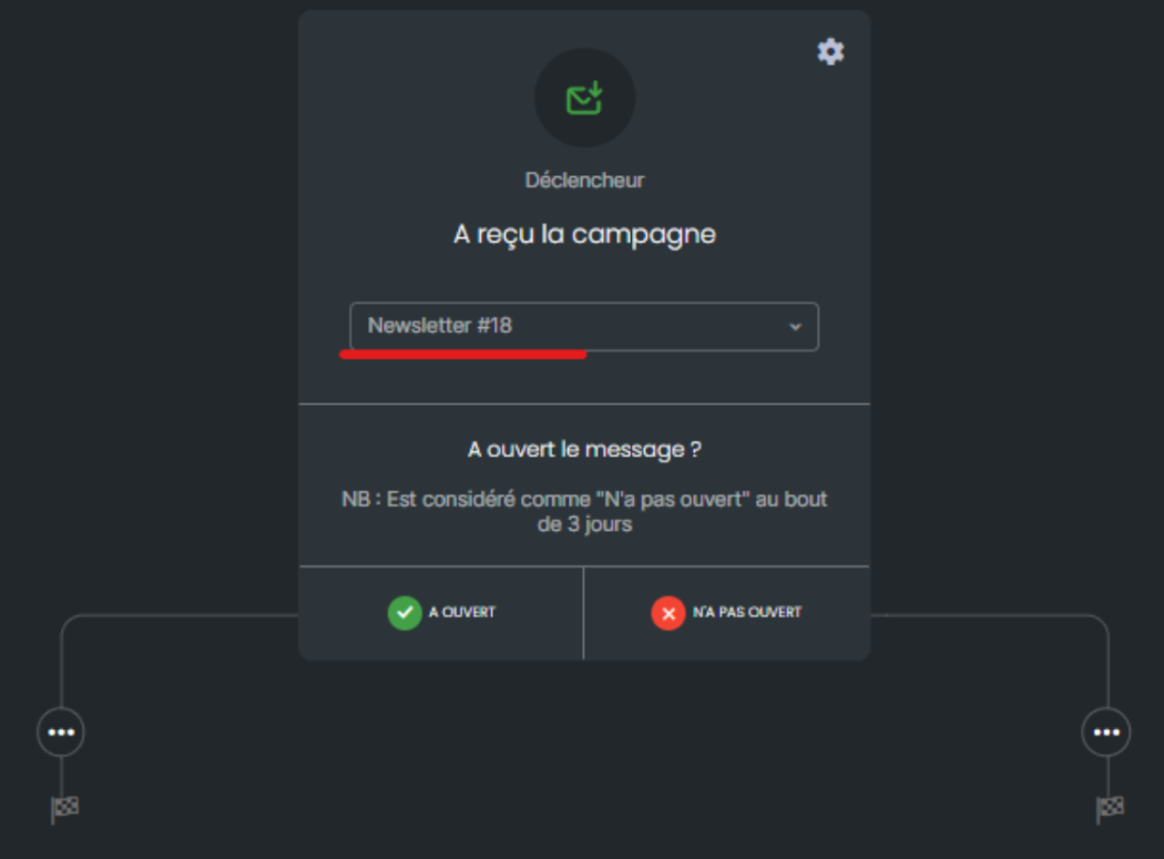 Un roue crantée au niveau de votre déclencheur, vous permet de choisir l’élément déclencheur de votre message : si le destinataire a ouvert ou non votre message, cliqué ou non sur votre lien, etc.