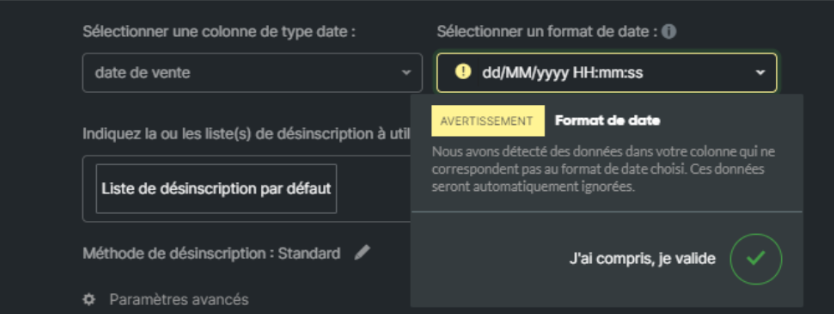 La première chose à vérifier après avoir sélectionné votre liste de contacts est la correspondance avec un format date :