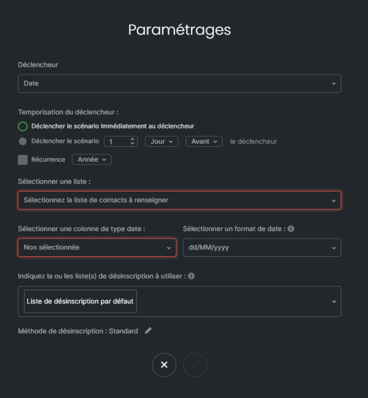 Ce scénario est utilisé pour envoyer des emails basés sur des dates spécifiques ou des événements temporels importants, à condition qu'une colonne de type date soit présente dans votre liste de contacts.
