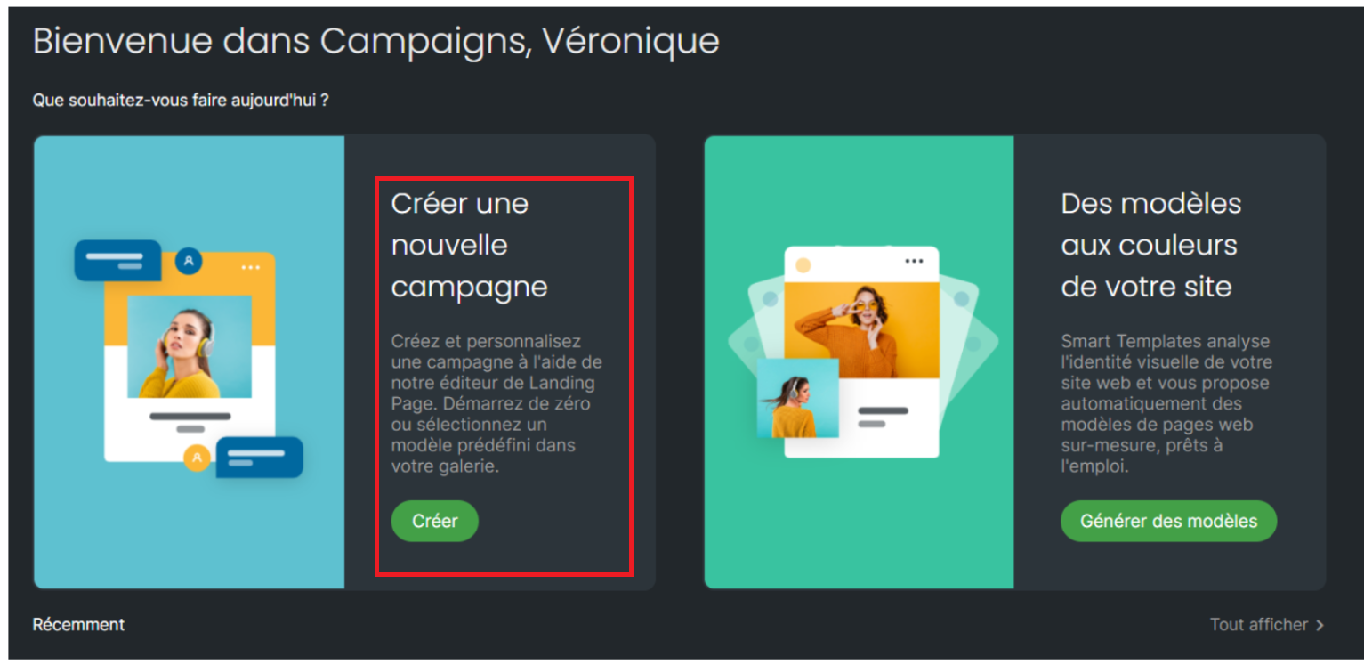 Pour cela, rendez-vous sur l’application “Campaigns”, puis sur le bloc “Créer une nouvelle campagne”.