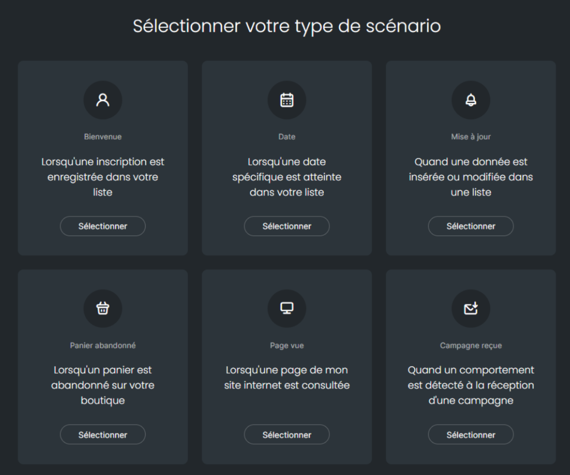 Nous allons ci-après détailler les différents scénarios automatiques proposés par Sarbacane Suite.