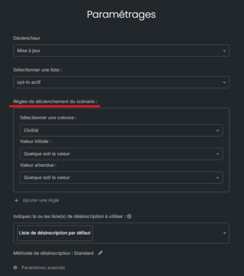 Le + de ce déclencheur : il permet de maximiser l'impact de vos campagnes marketing en réagissant automatiquement et de manière ciblée aux actions des destinataires, favorisant ainsi un engagement accru et des taux de conversion améliorés.