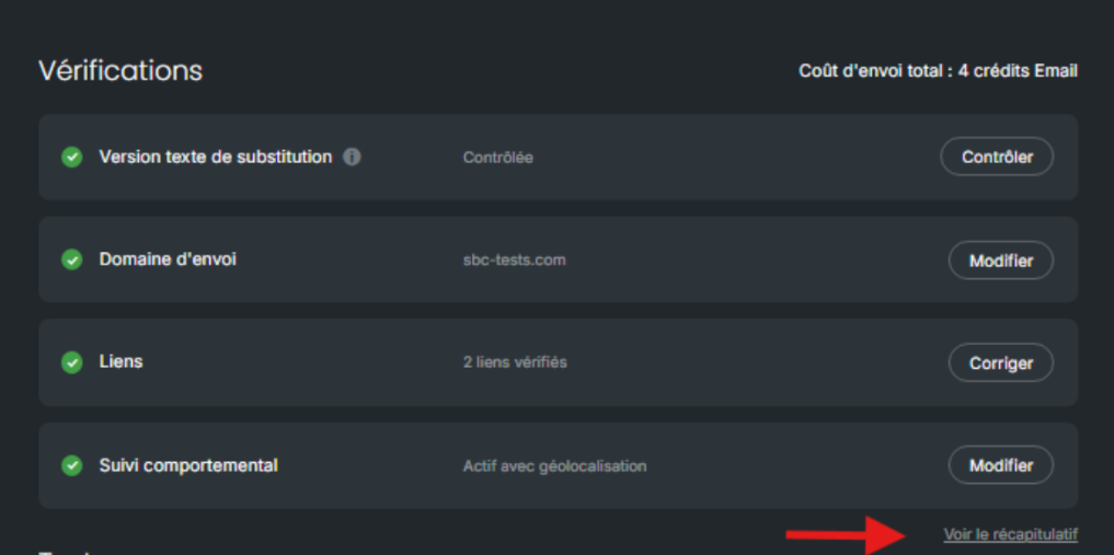 Afin de vous assurer que votre message ne dépasse pas cette limite, vous pouvez vous rendre dans la partie Vérifications de votre compte, puis sélectionner Voir le récapitulatif :