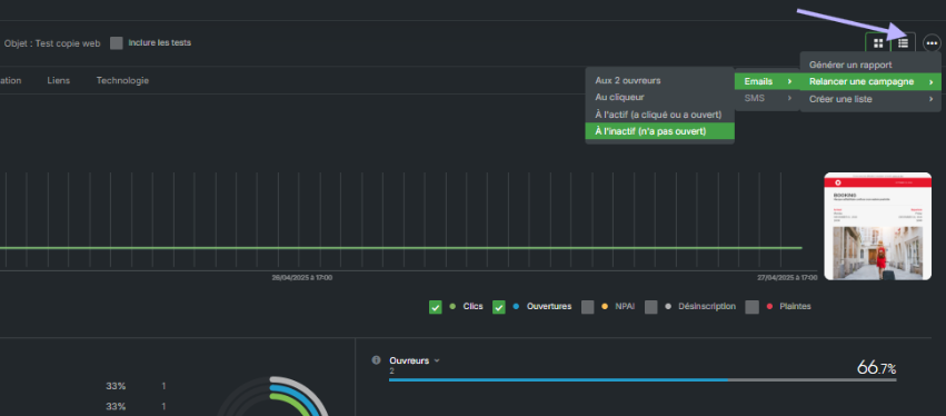 Cliquez sur les 3 points de suspension en haut à droite de votre écran afin d’accéder à l’option “relancer une campagne”. Vous pourrez choisir de relancer une campagne Email ou SMS en fonction de la campagne initiale.