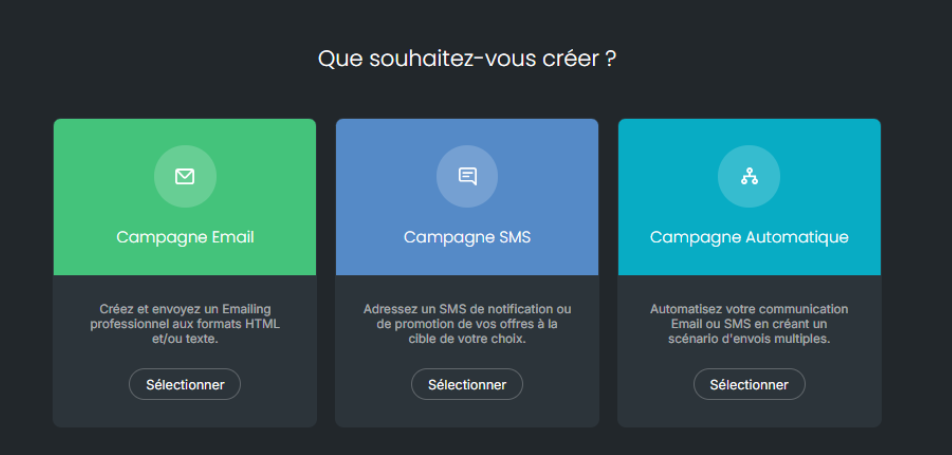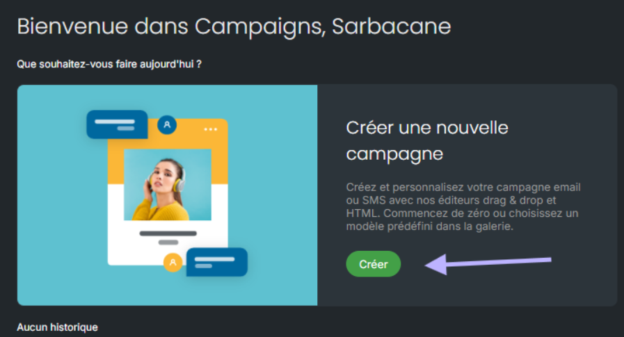Depuis Sarbacane, vous pouvez créer aussi bien des campagnes email que des campagnes SMS. Pour réaliser une campagne SMS, cliquez sur “créer” dans la partie Campaigns de votre compte.
