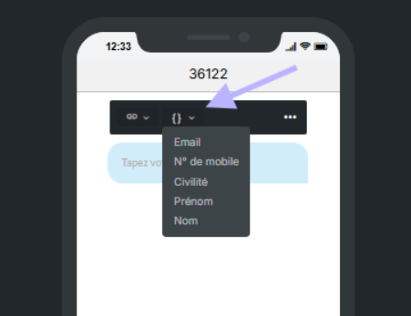 L’option de personnalisation, disponible à côté du champ de texte, vous permet d’ajouter des variables dynamiques à votre message.