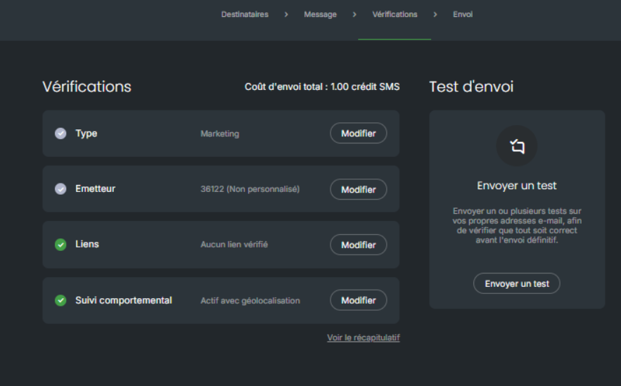 L’étape suivante vous permet d’avoir un récapitulatif de votre message et d’envoyer un test avant l’envoi final.
