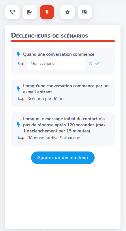Vous pouvez configurer les déclencheurs de scénario en allant dans l'éditeur de scénario de conversation et en cliquant sur l'onglet déclencheur de scénario. Vous pourrez alors voir tous les déclencheurs actifs et les scénarios qui seront lancés lorsque la condition sera remplie.