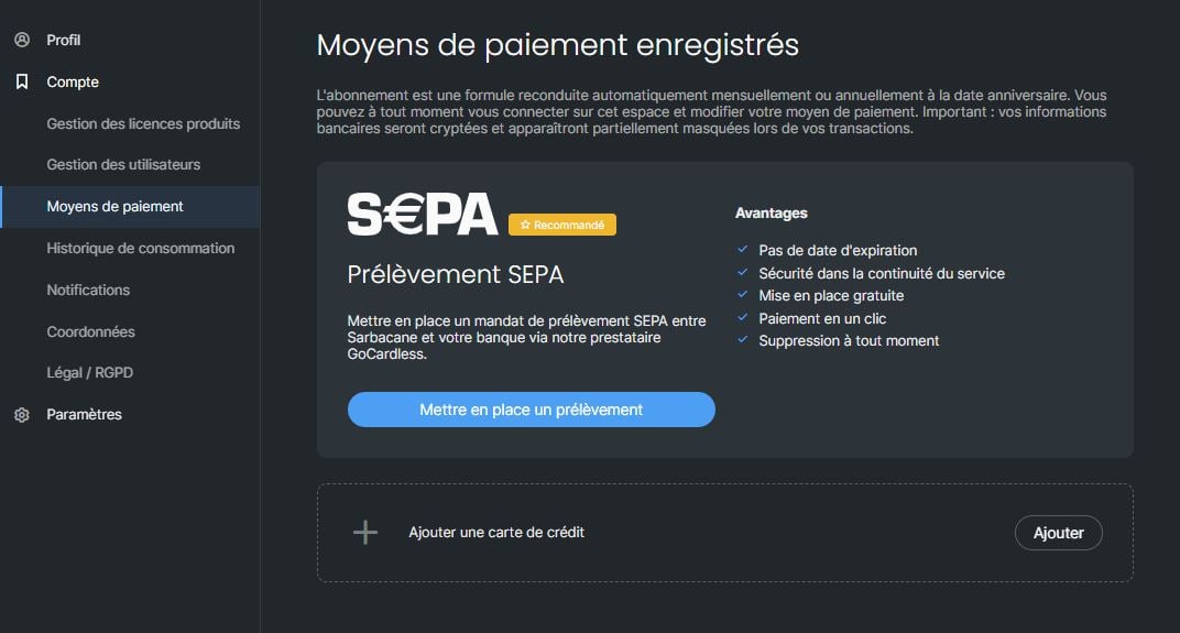 Cette section, disponible uniquement pour le propriétaire et les administrateurs, vous permet d’enregistrer et paramétrer vos moyens de paiement.