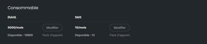 Enfin, vous trouverez également un aperçu de vos crédits d'envoi disponibles si vous avez acheté une licence nécessitant du consommable (Campaigns et/ou Sendkit).