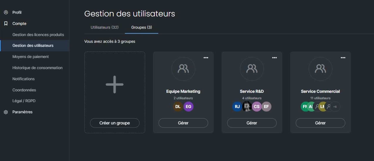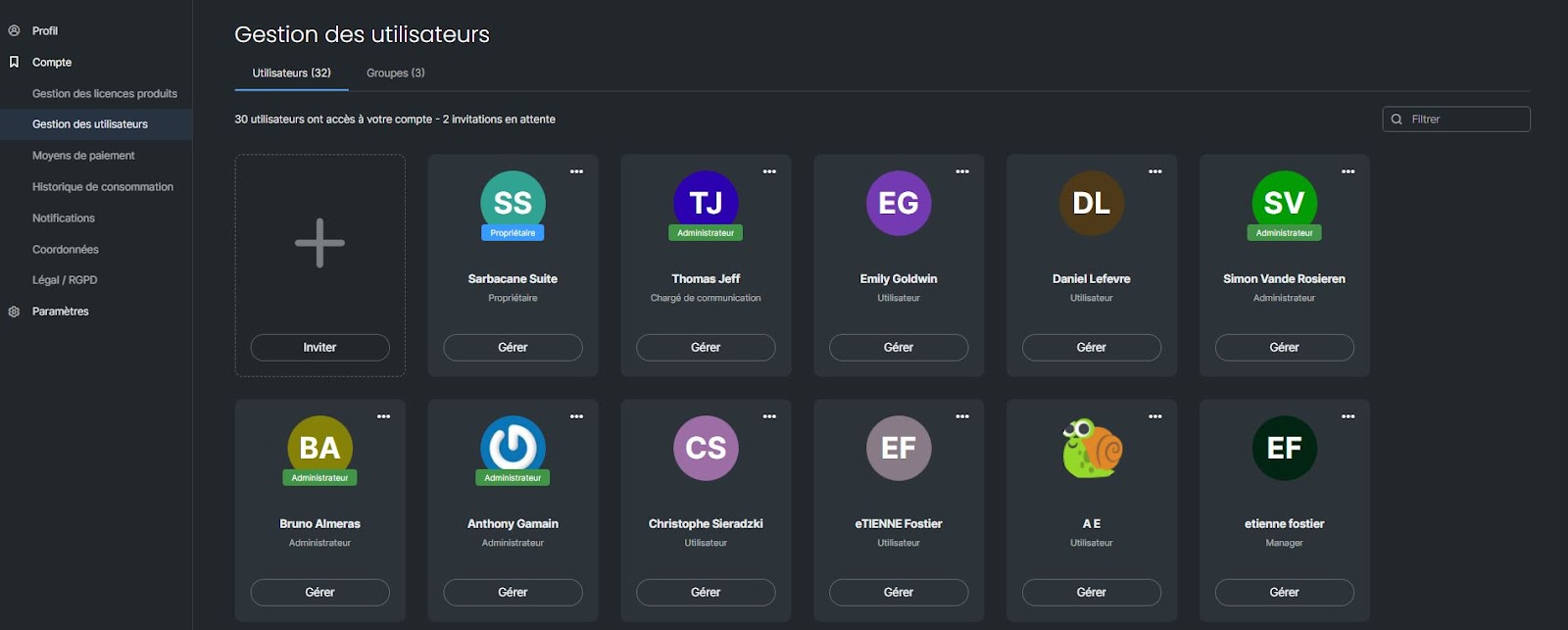 Cette section vous permettra d’inviter de nouveaux utilisateurs sur votre compte mais aussi de gérer leur profil, l’attribution ou la révocation de licences mais aussi gérer les droits et autorisations de chaque utilisateur.