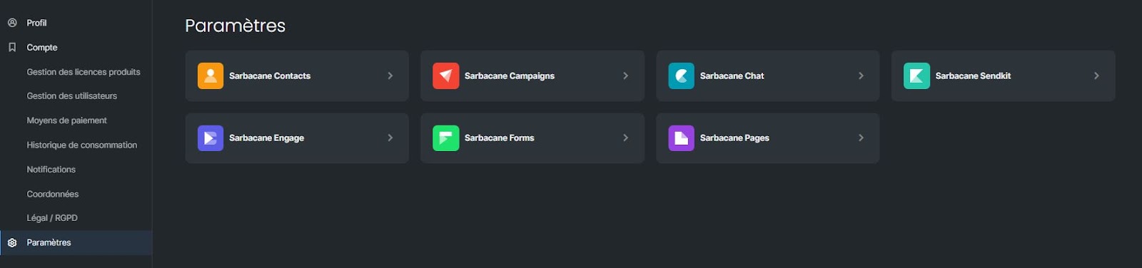 Cette dernière section vous permet d’accéder aux paramètres propres à chaque application de Sarbacane Suite.