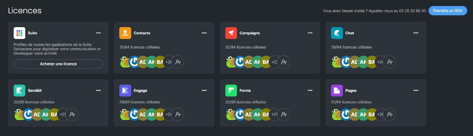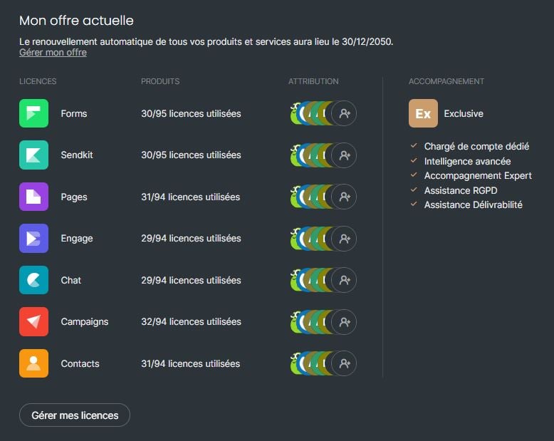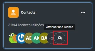 Cette section, disponible uniquement pour le propriétaire et les administrateurs, vous permettra de visualiser le nombre de licences disponibles VS celles qui sont déjà attribuées.