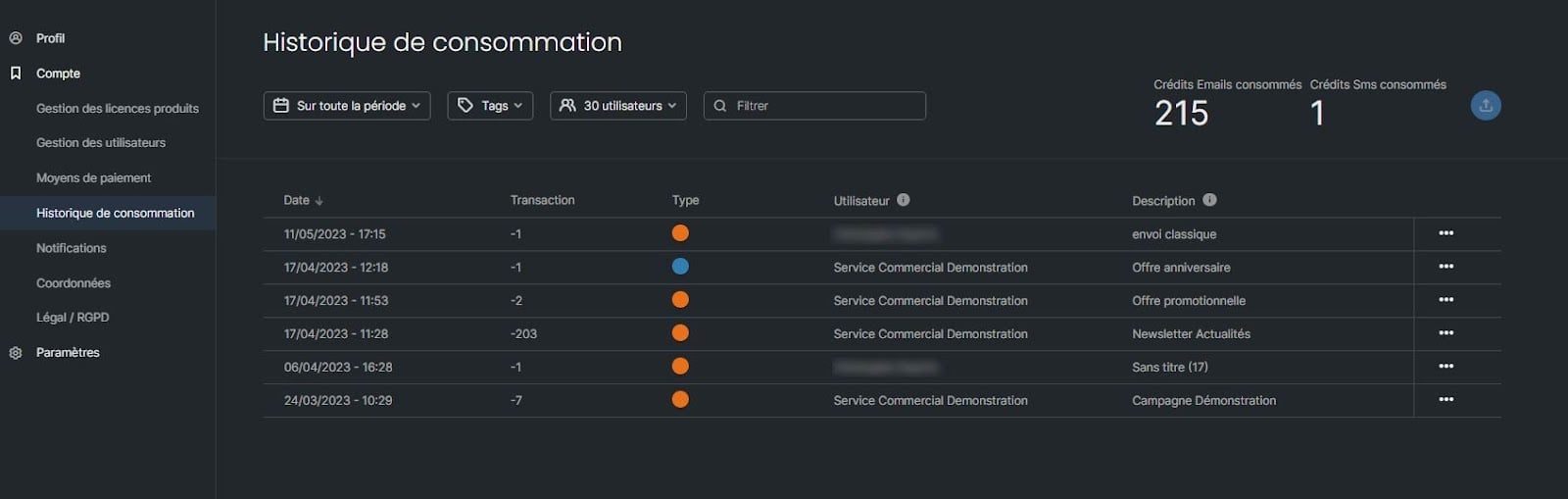 Cette section vous permet de visualiser votre historique de consommation de crédits emails et/ou SMS sous forme de tableau avec :
