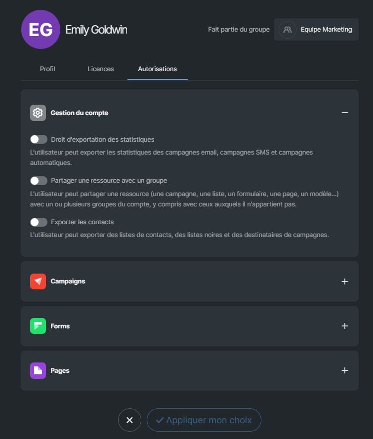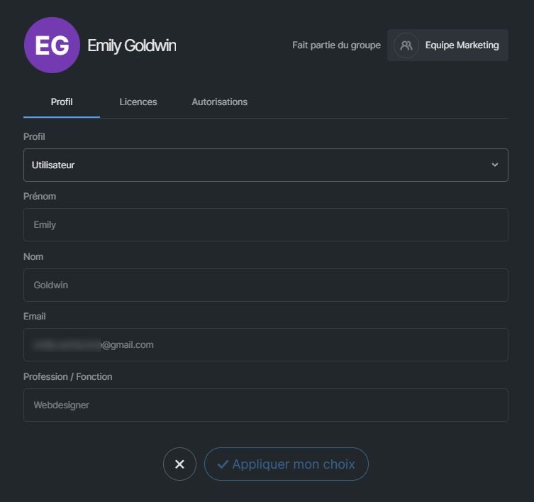 En cliquant sur le bouton “Gérer”, vous pourrez accéder et modifier les éléments suivants pour chaque utilisateur :
