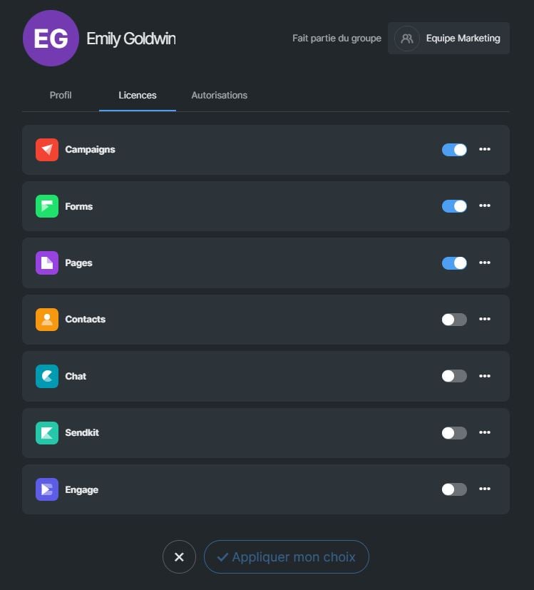 Les licences : vous pouvez ici cocher ou décocher les applications auxquelles l’utilisateur peut avoir accès (ce qui signifie lui attribuer ou lui désattribuer une licence pour une application)
