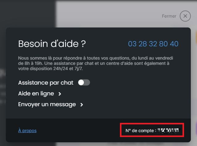Pour trouver votre numéro de compte client, connectez-vous à votre compte, puis cliquez sur la section “Aide” dans le menu en haut à droite de l’interface.